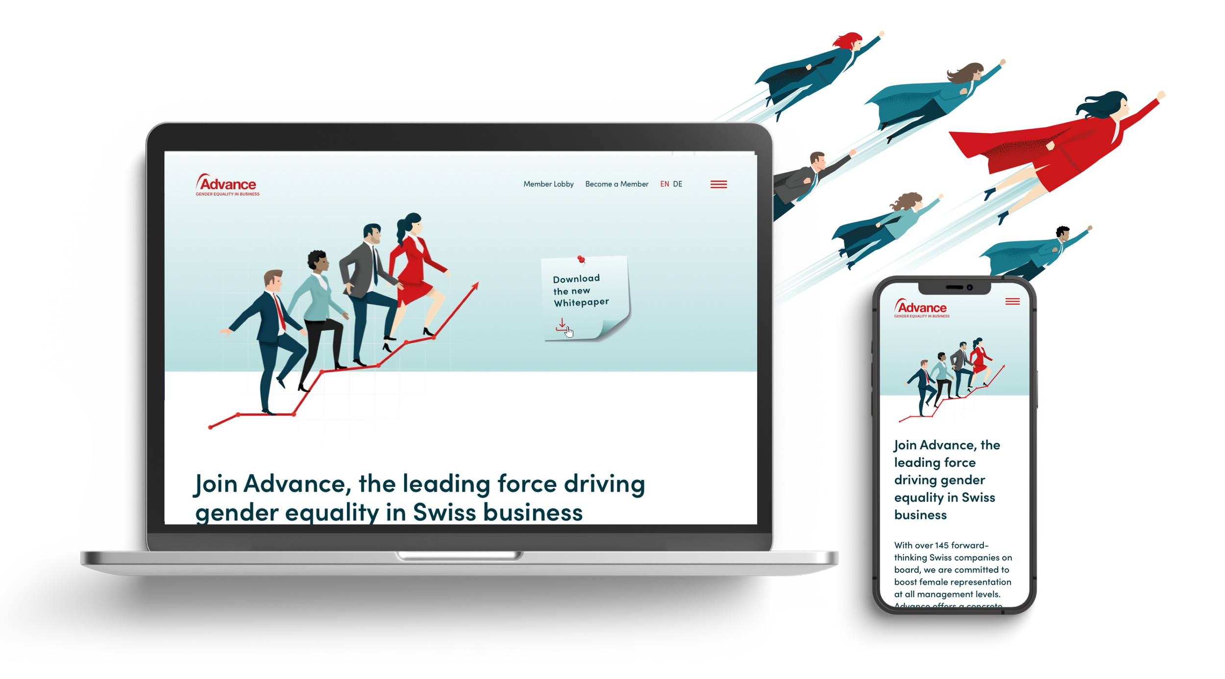 Advance setzt sich als führender Wirtschaftsverband für Geschlechtergleichstellung in der Schweiz dafür ein, den Frauenanteil im Management nachhaltig zu erhöhen und Chancengleichheit in der Wirtschaft strukturell zu verankern. Mit über 100 namhaften Mitgliedsunternehmen benötigte Advance eine starke, einheitliche visuelle Identität, die Professionalität, Führungskraft und Modernität vermittelt. Ich begleite Advance seit rund acht Jahren als Sparringpartnerin für Design und Eventbrandings und habe dabei den kompletten strategischen und visuellen Aufbau des Organisationsauftritts verantwortet.